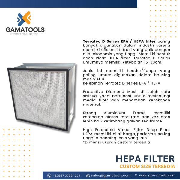 HEPA filter yang paling banyak digunakan dalam industri karena memiliki efisiensi filtrasi yang baik dengan nilai ekonomis yang tinggi. Memiliki bentuk deep Pleat HEPA filter, Terratec D Series umumnya memiliki ketebalan 15-30cm.